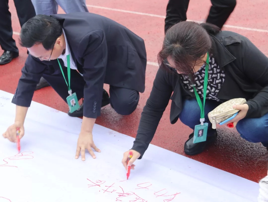 之后,師生們來到了百米長卷面前,用筆墨書寫了心聲和誓言。大家不忘初心,牢記使命。主席臺上,高一年級的張詩琪、曾伊萌、孔令羽和鄭暢同學為我們帶來了歌曲演唱《最初的夢想》。歌聲飄蕩在衡川運動場的上空,最初的夢想永遠在我們心中。