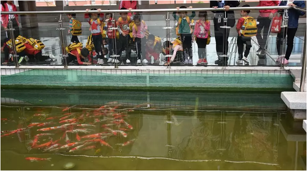 走在玻璃棧道上,孩子們膽怯又好奇,小心翼翼地走著,興致勃勃地看著,當(dāng)看到玻璃下結(jié)隊(duì)的鯉魚(yú)時(shí),孩子們激動(dòng)不已,紛紛趴下來(lái)觀(guān)看。