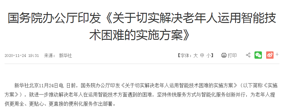 11月24日,國務(wù)院辦公廳印發(fā)了《關(guān)于切實(shí)解決老年人運(yùn)用智能技術(shù)困難實(shí)施方案》的通知,要求各類日常生活場景中,必須保留老年人熟悉的傳統(tǒng)服務(wù)方式。