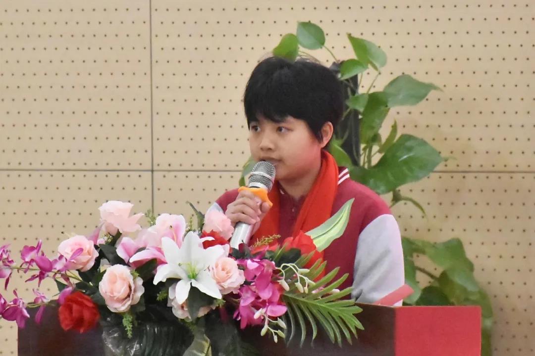 (904班學生代表蔡浩:能幫助你成功的要素有五個,你完全可以憑借他們獲得成功女神的青睞——第一是勤奮,第二是踏實,第三是科學,第四是高效,第五才輪得上智商。)